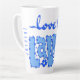Brighten every morning with our beautiful "Love to Laugh" Latte Mug. It has a whimsical, floral edged font that is hand drawn and a dark and light blue color palette. The elegant, tapered silhouette makes it the perfect vessel for creamy lattes, frothy cappuccinos, or a comforting tall cup of tea.