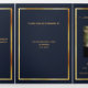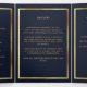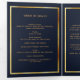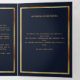 An elegant tri-fold program. A dark blue background, a faux gold frame and space for your photo. Personalise and add name, dates and your text.