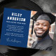 Modern, dark blue or custom colour graduation photo announcement card featuring your photo and the graduate's name in a modern college sports style font. White text on dark blue background. Colours and fonts are customisable in the design tool.