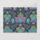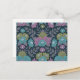 This postcard has flowers in shades of purple, blue, and olive green surrounded by muted purple fern fronds and leaves on a dark blue background.