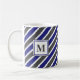 Diagonal striped pattern coffee mug in white, dark blue and grey with monograms on both sides in matching colours.