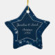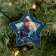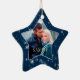 This pretty Christmas ornament features your own photo within a sparkling star shaped faux diamond frame. The frame is placed on a dark blue night sky background decorated with white snowflakes and stars. The back of the ornament has the same background, with your custom text in white on the matching blue centre. A beautiful keepsake ornament to commemorate your special Christmas together!