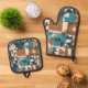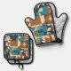 Dark Blue, Teal, Brown, and Tan Geometric Pattern Oven Mitt & Pot Holder Set