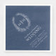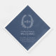Oval wreath leaf design n white on navy blue wedding napkins. Add your own couples monogram initials, name, and wedding date in a classic white on navy dark blue. Other colours and matching wedding items available. © Original leaf drawing and design by Sarah Trett for www.mylittleedenweddings.com on Zazzle.