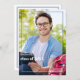 Unique and trendy congratulations graduate announcement and celebration part invitation card, framed with a stylish dark blue and white border pattern. With room to customize or personalize with a photo, the name of the graduate, class graduation year, high school, future college or university name, and celebration party event information. Let the family, friends and neighbors know there is a happy graduate ready to conquer the world, and invite everybody to come celebrate the happy event with you!