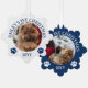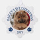Snowflake shaped photo ornament with a round photo of your puppy with curved text and cute paw prints in blue and white.