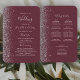 This elegant, modern wedding program fan features a dark burgundy background edged with silver faux glitter. The text appears in elegant silver grey handwriting and copperplate fonts.