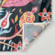Silhouettes of flowers and birds adorn a dark background in this ornamental pattern.