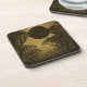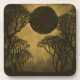Grungy and cool Dark Forest Eclipse Cork Coaster Set in gold featuring a quiet forest scene with a lunar eclipse. This digital art coaster set is perfect for protecting your furniture with style. Customise with your own text.