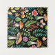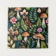 Mushroomcore artwork features forest flora and fungi in a pattern style against a black background. Flower blooms, ferns, toadstool mushrooms, and more in shades of green, brown, orange, pink, and purple, overall on the warmer side. Dark cottagecore or goblincore aesthetic.