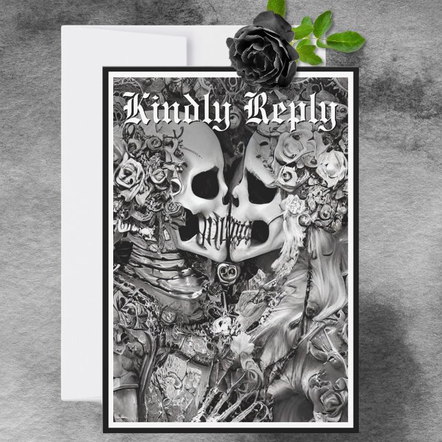 Step into a world where timeless romance meets gothic elegance with our exquisite wedding response card with QR code, perfect for your "Until Death Do Us Part" theme. This stunning design features a skeleton couple locked in a romantic kiss, adorned with delicate white roses and intricate lace, all set against a dramatic black and white backdrop. The back reveals a luxurious white water taffeta reminiscent of coffin lining, with your personalised details in striking black text. Let your love story be as unique and eternal as this unforgettable design. Created by Simply Farmhouse Press.