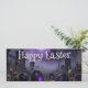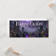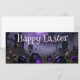 A mysterious Easter scene set in a foggy graveyard with glowing purple eggs and a gothic cathedral in the background. Dark tones, misty atmosphere and eerie lighting create a unique, haunting twist on traditional Easter imagery.