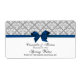 Dark Gray & White Damask, Navy Blue Satin Look Bow - Water Bottle Label / Wine Bottle Label