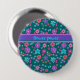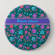 A pretty round Button or Badge, with a pattern of bright flowers in purple, turquoise, pink and orange on a dark green background, from a handpainted paper collage by Judy Adamson. You can easily change the background colour, if you wish, by using the Edit button.