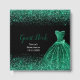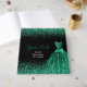 A beautiful Dark Green themed elegant watercolor dress gown on a black background with faux glitter at the top and bottom of the guest book.