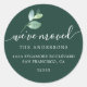 Dark green eucalyptus we’ve moved address label featuring soft watercolor greenery, flowing white calligraphy, and clean serif address details on a rich green background. The round format and botanical styling create a polished, modern look that feels calm, elegant, and easy to read. Ideal for announcing a move with a nature-inspired design that stands out beautifully on envelopes. Easily personalize with your details.