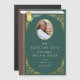This fun yet romantic wedding save the date card features a book illustration with hand-drawn floral accents in faux gold foil, an oval photo, and vintage inspired typography. The book background and text colors are customizable. The look is romantic and elegant, like a classic storybook! See the collection for additional items.