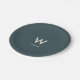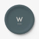 Trendy personal party paper plates featuring dark blue green background, large centred monogram and associated name. Clean, simple minimalist typography. Fully personalizable.
