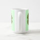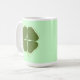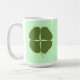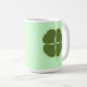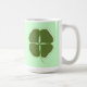 Painting of a green shamrock, four leaf clover, centred in an outline drawing of a four leaf clover, printed on two sides of a mug. The background colour can be changed. To choose a different background colour, click on Customise It, then on Edit, then on Background, and then on the colour of your choice. The Border colour is the edge colour.