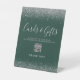 A chic, elegant sign to direct wedding guests to your cards and gifts table. The phrase "Card & Gifts" appears in silver grey handwriting calligraphy on a dark emerald green background. Add a QR code by entering your website URL to invite guests to contribute to your honeymoon fund. Silver faux glitter borders decorate the top and bottom edges.