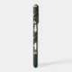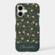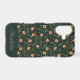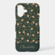 Modern and elegant iPhone case design featuring pattern that has hand painted watercolor small pink flowers and green foliage on a dark green background. Can be personalised with a name.