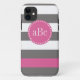 Dark grey and white stripes with a pink circle and space for a monogram.
