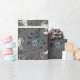 This Dark Grey Baby Goth Rocking Horse Wrapping Paper features hand-drawn illustrations of a vintage wooden rocking horse with French blue detailing, roses in matching blues and creams, wildflowers, leaves, black bats, spiderwebs and twinkling stars, all against a dark grey background. Ideal for Gothic baby showers or any occasion celebrating baby boy during the spooky Halloween season.