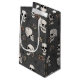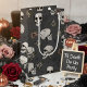 Hand-drawn in black ink, this gift bag features a beautiful pattern of skulls, roses and spiderwebs in cream and blush tones, all against an elegant dark grey background.