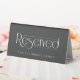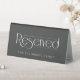 This editable elegant grey wedding table reserved sign template featuring a beautiful "Reserved" lettering and personalisation. Background and font colours can be changed, just click on "Customise futher". This doublesided Reserved sign will be a nice addition to Wedding table decor. Text is customisable, so you can easily add your own.