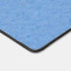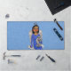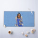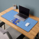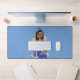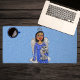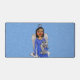 This desk mat has a dark haired angel in a blue dress with white stars sitting on a cloud holding a white angel cat on a sky blue background.