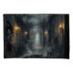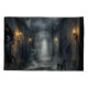 A dark fantasy artwork featuring a haunted stone corridor, glowing lanterns, a mysterious deep hole, and a surreal moonlit sky. Perfect for fans of gothic art, horror themes, and surreal dreamlike scenes. This atmospheric design adds a dramatic and eerie touch to any product.