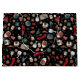 hygge christmas seamless pattern with cute and cosy christmas items on a black background. dark xmas wrapping paper with hand drawn pine trees, santa's socks, mittens, holiday candles, cookies, presents, candy canes, cinnamon, cloves, hot drink, homemade chocolate candies, apples, oranges. winter holiday repeating pattern.