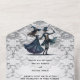 A Gothic wedding all in one invitation featuring a couple of skeleton dancing, with the full moon on the back, on a grunge darkish lace background. The card also includes meal choice options for guests to select from, and your guest can scan the code to RSVP, or send the card by regular mail. Perfect for an elegant Gothic Halloween wedding. On the front side, the design includes a monogram and the date of your wedding. Follow the instructions to personalise the invite with your wedding details. Prepare in advance the wording in a separate document, and copy and paste the info.