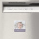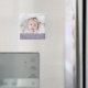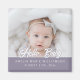 This fridge magnet features a contemporary styled font "Hello, Baby" at the bottom edge of the your own baby photo above a dark mauve purple background with your baby's name and birth date in a modern clean crisp printed white font.