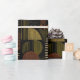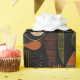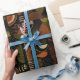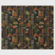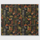 Sophisticated mid-century geometric pattern wrapping paper featuring layered circles, arches, triangles, and rectangles in forest green, burnt orange, ochre, and cream on a black background. Rich textures and retro-modern shapes create a bold design ideal for Bauhaus lovers, vintage décor fans, and anyone drawn to moody modern style.