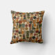 Sophisticated mid-century geometric pattern throw pillow featuring layered circles, arches, triangles, and rectangles in forest green, burnt orange, ochre, and cream on a black background. Rich textures and retro-modern shapes create a bold design ideal for Bauhaus lovers, vintage décor fans, and anyone drawn to moody modern style.