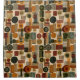 Sophisticated mid-century geometric pattern shower curtain featuring layered circles, arches, triangles, and rectangles in forest green, burnt orange, ochre, and cream on a black background. Rich textures and retro-modern shapes create a bold design ideal for Bauhaus lovers, vintage décor fans, and anyone drawn to moody modern style.