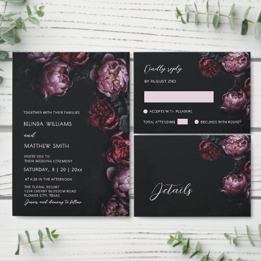 Dark Moody 3D Flowers Wedding Invitation