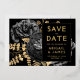 This elegant, moody wedding Save the Date card features a lush, romantic floral bouquet in black with gold faux foil and glitter foliage on a black background. Customise the real gold foil text in stylish fonts on a gold-bordered black rectangle, and add your wedding website URL to the solid black back.