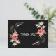 Express your gratitude in style with this elegant thank you card, perfect for any occasion. Featuring a bold black background adorned with delicate floral arrangements in soft blush and white tones, this card strikes a beautiful balance between sophistication and warmth. The front simply says "Thank You" in graceful typography, while the back offers space for a customisable message, allowing you to add a personal touch. Ideal for weddings, special events, or heartfelt notes, this design is sure to leave a lasting impression on your recipients.