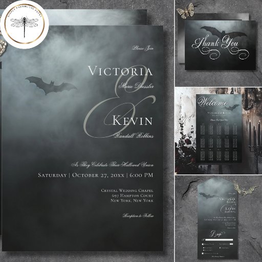 AVAILABLE WITH A QR CODE OR WITH OR WITHOUT DINNER SELECTION OPTIONS. Step into the realm of eternal love and enchantment with our captivating gothic wedding invitation. Unveil the mystique of your love story with this spellbinding design, where simplicity meets elegance in a dance of darkness and light. Against a midnight black backdrop, a veil of wispy fog intertwines with creamy moon white text, casting an aura of mystery and romance. Amidst this ethereal scene, a lone bat gracefully soars, adding a touch of intrigue to your tale. Let your love story be etched in the shadows of time with this exquisite invitation, where every word whispers of eternal devotion and passion. Created by Simply Farmhouse Press.