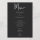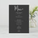 This wedding menu design features a dark, moody theme that is simple, yet stunning. A dark charcoal black background is the perfect canvas for your wedding meal text. The back features the couple's first names and wedding date. Unique and elegant, this design can be used for any season. Created by Simply Farmhouse Press.