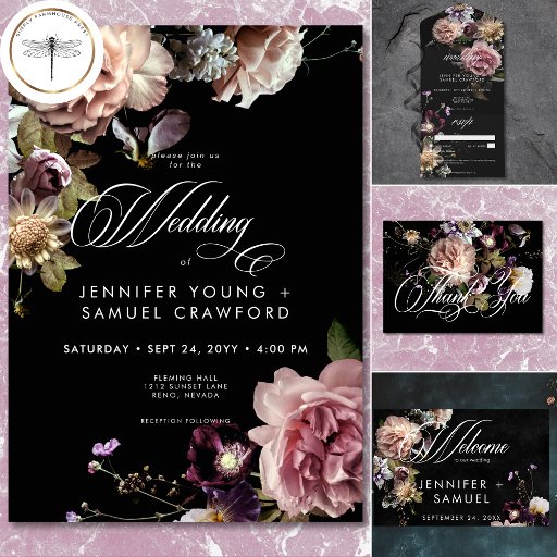Dark Moody Pastel Opulent Floral Black Wedding Invitation