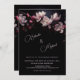 This dark moody romantic wedding invitation features light pink magnolia flowers on a black background. Bride and groom first names in an elegant classic calligraphic script.