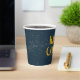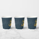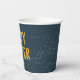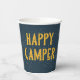 "Happy Camper" cup with starry night sky design. Dark navy background with twinkling stars and yellow text. Host a camping-themed birthday party or shower and all the happy campers will love drinking from these cups.