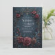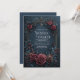 Create an atmosphere of timeless romance and sophisticated drama with this exquisite invitation design. The artwork is centered around an elegant oval frame made of antique gold filigree, set against a rich, dark navy textured background that mimics the depth of the night sky. The frame is draped with lush arrangements of deep burgundy and crimson blooms, accented by dark blue foliage and small berry clusters that add texture and dimension. This moody and luxurious color palette is perfect for couples seeking a design that feels both vintage and strikingly modern. This grand and stately design is a flawless choice for a formal winter wedding, a black-tie evening gala, or a romantic Valentine's Day celebration. You might also select this dramatic aesthetic for a milestone anniversary party, a sophisticated engagement dinner, or a masquerade ball invitation. This moody floral border is also perfectly suitable for memorial service programs, high-end salon service menus, or luxury boutique gift certificates.