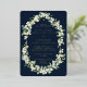 A dark navy reception only wedding invitation, featuring hand painted snowberries and stems of eucalyptus arranged into a beautiful botanical frame. The text and scattered dots on the front of the card are foil pressed. All text is fully editable. Please view this Collection in my store for invitations with alternative wording options, different colours and for coordinating items.