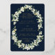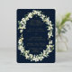 A dark navy reception only wedding invitation, featuring hand painted snowberries and stems of eucalyptus arranged into a beautiful botanical frame. The text and scattered dots on the front of the card are foil pressed. All text is fully editable. Please view this Collection in my store for invitations with alternative wording options, different colours and for coordinating items.