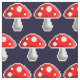 A pixel art fly agaric mushroom with white outlines to show on dark colours. The red spotted mushroom is on a dark blue background. The background colour can be changed.