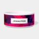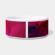 Personalised pet bowl with a cool abstract background. Dark red and purple brush strokes create a bold modern vibrant design. A rectangle layered over top with a personalised text inside.
